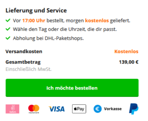 Laut dem Shop erhaltet ihr die Ware am nächsten Tag, wenn ihr bis 17:00 Uhr dort bestellt.