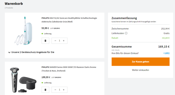 Bei Saturn gibt es dazu mehrerer Aktionen den Philips Shaver Series 9000 S9987/55 für 159,15€ + eine Philips Sonicare Zahnbürste GRATIS (Vergleichspreis: ~199€ + 54€) Ersparnis ~94€