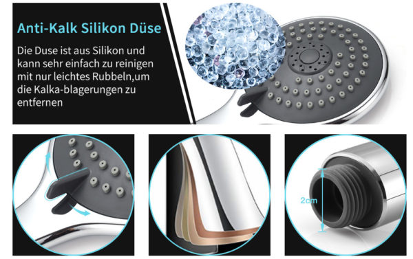- Duschkopf mit 3 Strahlarten , er besteht aus hochwertigem ABS-Material und besitzt selbstreinigende Silikon-Düsen.