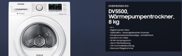 Bei Amazon gibt es Samsung DV80M5210IW/EG Wärmepumpentrockner/8kg/60 cm Höhe/Kondenswasserstandsanzeige/Kurzprogramm/Alarm Mischbeladung/SmartCheck