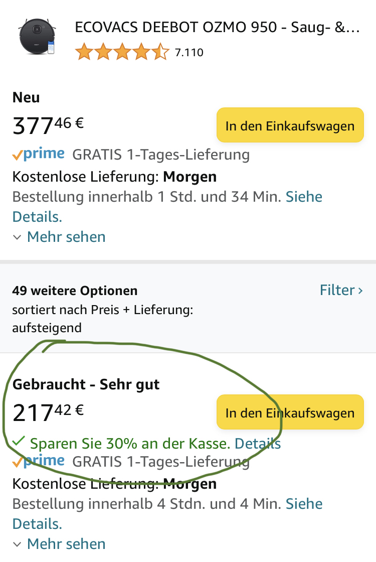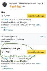 Bei Amazon bekommt ihr als WHD den Ecovacs Ozmo 950 Wisch-Saugroboter für mehrere Etagen für 152,19€ (Vergleichspreis ~217€) Ersparnis ~65€