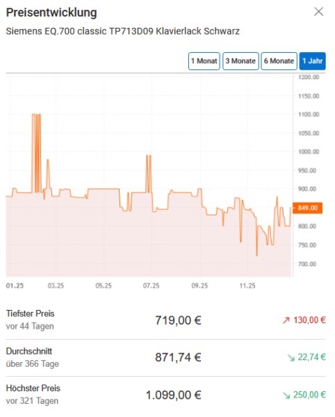 Bei MediaMarkt gibt es gerade den Siemens TP713D09 EQ.700 Classic Kaffeevollautomat für 713,45€ (Vergleichspreis: 849€) Ersparnis ~135,55€