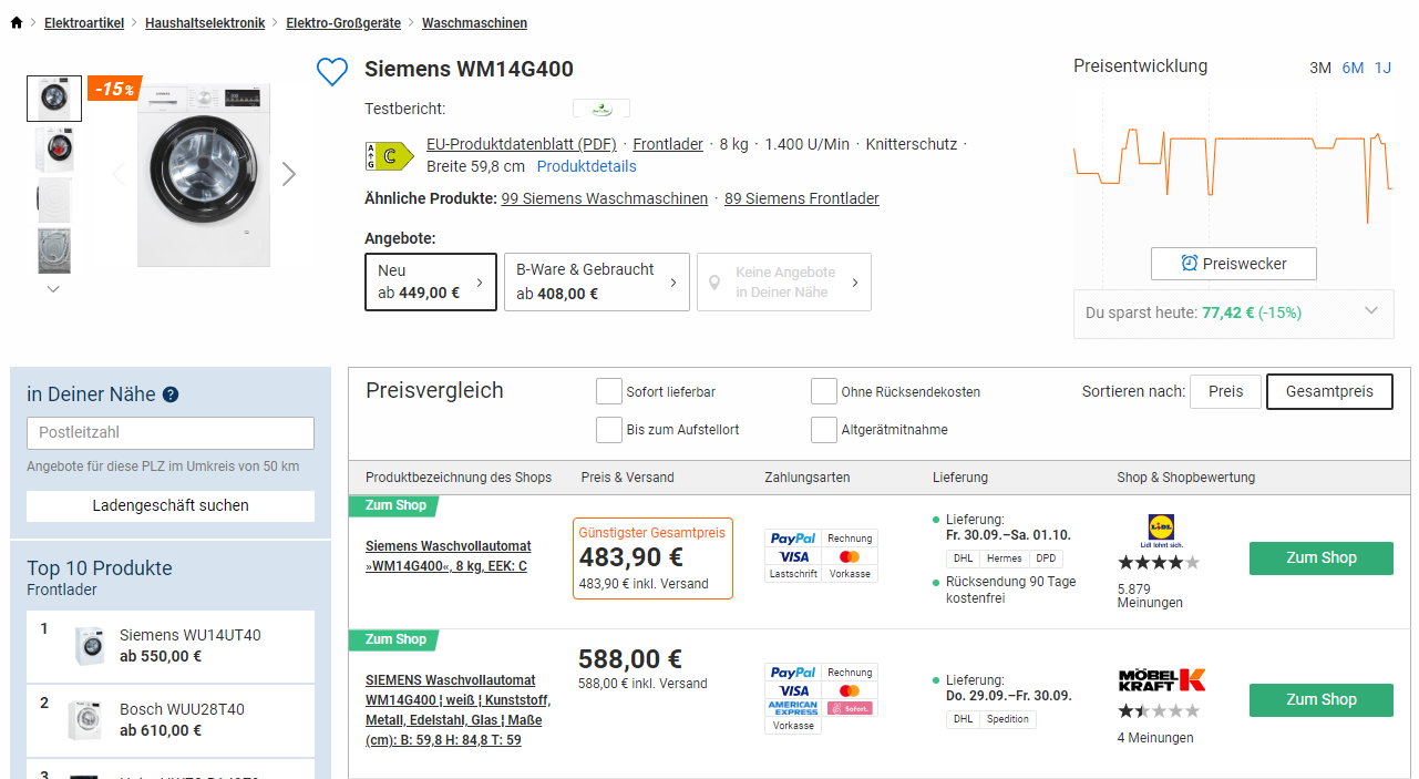 Denn bei LIDL im Online-Shop bekommt man die Siemens WM14G400 Waschmaschine (1.400 U/Min.) für 483,90€ (Vergleichspreis: ~588€) Ersparnis ~104€