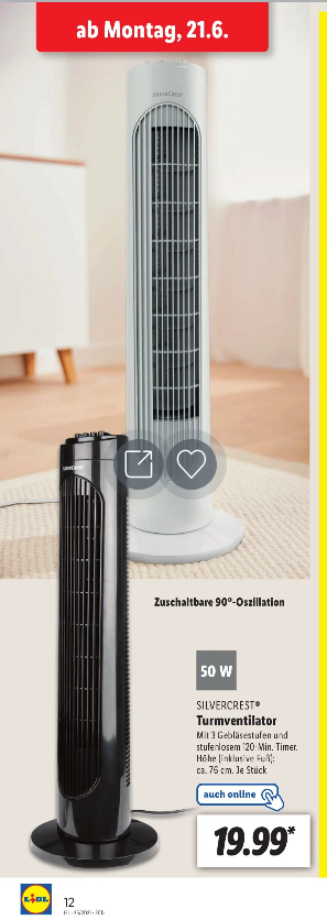Du meinst bestimmt in den Filialen. Da gibt es schon ab Montag die Tower Ventilator für 19,99 €. Online ist der Preis aber auch gut mit 24,94 € inkl. Versand.