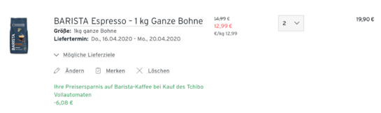 Matthi 14.04.2020, 17:50 # hilfreichTIPP: Wer gleich noch Kaffe (BARISTA) mitbestellt, der kann zusätzlich sparen.