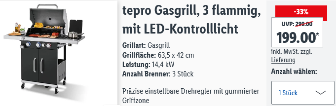 Bei LIDL erhaltet ihr gerade den Tepro Gasgrill (3-flammig, 4 Garzonen) für 258,95€ (regulärer Preis: ~329€) Ersparnis ggü. UVP ~70€