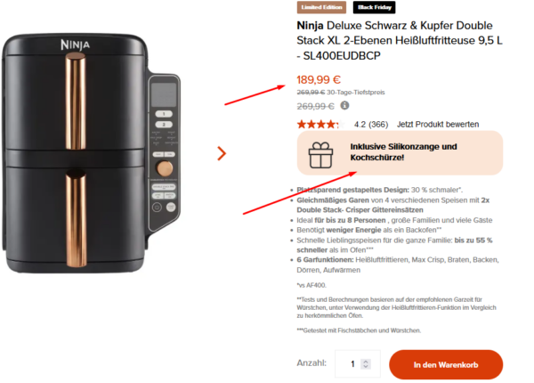 UmbaUmba 01.12.2024, 09:11 #Ich muss sagen das die Ninja Double Stack XL 9,5l hervorragend ist und kein Vergleich zu meiner alten Tefal Airfryer. Allerdings habe ich die beim örtlichen Euronics-Händler vor 2 Wochen gekauft für 179€. Online ist eben nicht immer günstiger