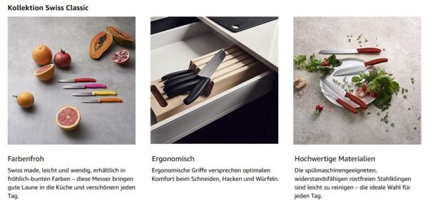 - SWISS MADE: Das Küchenmesser-Set mit Klingen aus rostfreiem Stahl wird in der Schweiz hergestellt. Die Messer sind langlebig, rostfrei und leicht zu reinigen.