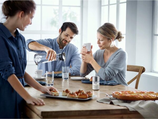 - Durch die große Öffnung ist ein leichtes Befüllen von Kaltgetränken (Wasser, Sprudel, Saft, Eistee uvm.) möglich. Die Karaffe passt in das Getränkefach eines handelsüblichen Kühlschranks
