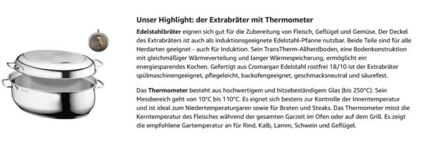 Bei Amazon gibt es den WMF Bräter mit Deckel backofengeeignet, 8,5l, Bräter Induktion, Cromargan Edelstahl, Glasdeckel, Bratenthermometer, 38 x 26 x 12 cm
