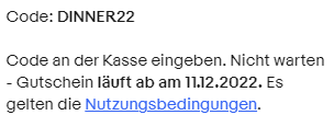 Um auch auf den Preis zu kommen, müsst ihr den Gutschein-Code DINNER22 verwenden.
