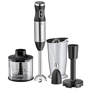 - Inhalt: 1x Stabmixer aus Cromargan Edelstahl (8 x 6 x 39 cm, 600 Watt, Kabellänge 1m), 1x Schneebesen, 1x Stampfer, 1x Zerkleinerer, 1x Mixbehälter (700 ml) mit Skalierung – Artikelnummer: 416720011