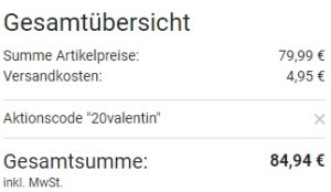Um auch auf den Preis zu kommen, müsst ihr den Aktionscode 20valentin verwenden.