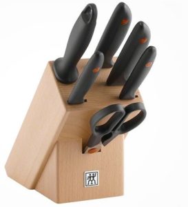 - Der Messerblock „Twin Point“ beinhaltet 4 Messer, 1 Wetzstahl, 1 Schere und den Messerblock aus Buche