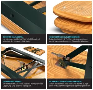 - Das Bierbank-Set besteht aus Kiefer- und Fichtenholz und ist mit einem klaren Holzlack lasiert, um vor eindringender Feuchtigkeit zu schützen. Das robuste Stahlgestell und die stabilen Scharniere sorgen für eine hervorragende Standfestigkeit und machen die Garnitur besonders langlebig. Die Oberseiten und Kanten des Holzes sind ebenfalls lackiert und sorgen für eine ansprechende Optik.