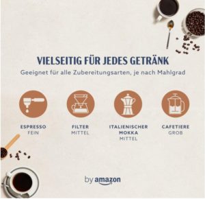 - Geeignet für alle Zubereitungsarten, je nach Mahlgrad. Espresso = fein. Filter = mittel. Italienischer Mokka = mittel. Cafetiere = grob