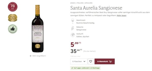 Wie wäre es mal wieder mit einem schönen Tröpfchen Wein, bei Weinbörse bekommt ihr 12 Flaschen Santa Aurelia Sangiovese (Rotwein, Italien, 2024) für 51,83€ (statt ~77€) Ersparnis ~25€