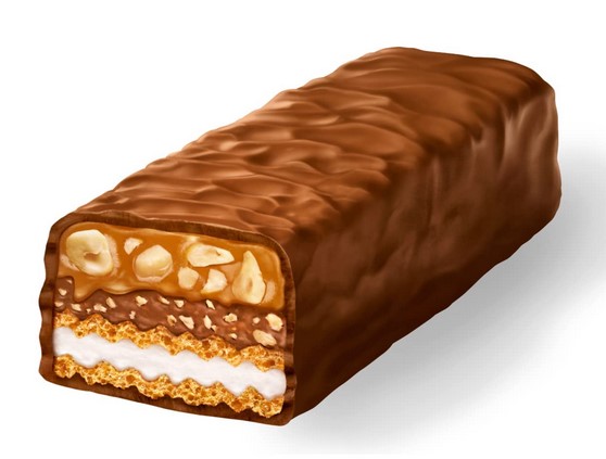 - Waffelriegel mit Milchcreme (14,4%), Kokoscreme verfeinert mit Haselnüssen (17%), Kokosraspeln (6,5%) und zartem Karamell (26,1%), umhüllt von Vollmilchschokolade (29,5%)