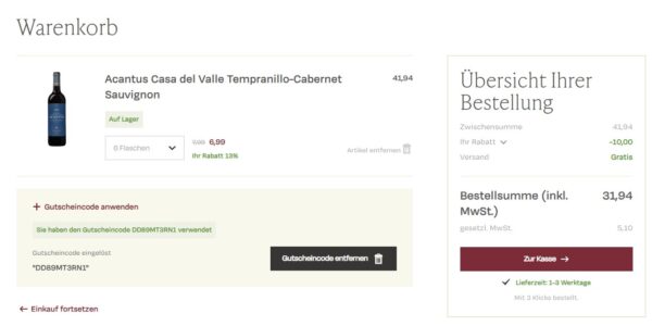 Für die Weinfreunde unter euch gibt es gerade bei Weinbörse 6 Flaschen Acantus Casa del Valle Tempranillo-Cabernet Sauvignon (Rotwein, 2021, Spanien) für 31,94€ (statt ~48€) Ersparnis ~16€