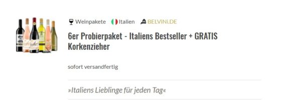 - Wenn Sie italienische Weine genauso lieben wie wir, haben wir mit diesem Paket genau das Richtige für Sie: 6 absolute Bestseller in einem Probierpaket – was will man mehr? Womöglich einen Korkenzieher. Den bekommen Sie gratis obendrein