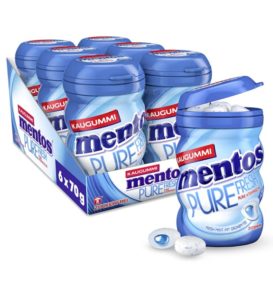 - Mentos Pure Fresh Mint Kaugummis kommen mit kühlendem Minzgeschmack und einem flüssigen Füllung daher, die durch Grüntee-Extrakt eine ganz besondere verleiht