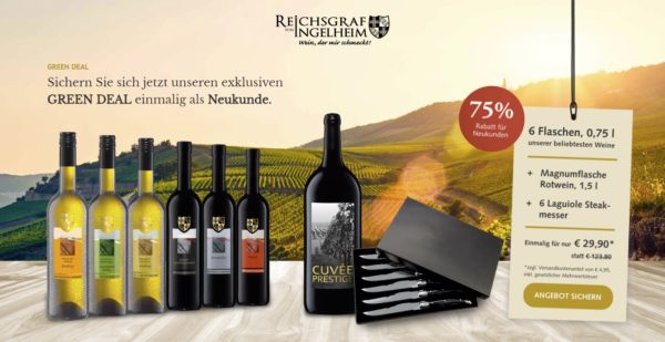 Als Neukunde bei Reichsgraf von Ingelheim erhaltet ihr 7 Flaschen Wein + 6 Steakmesser für 34,90€ (regulärer Preis: ~124€) Ersparnis ~89€