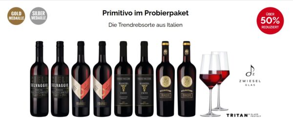 8 Flaschen Rotwein (Primitivo Paket) + 2 Schott Zwiesel Gläser für 39,90€ inkl. Versand