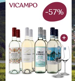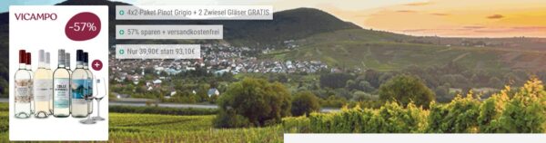 Das Rotweinpaket ist nicht so euer Ding, wie wäre es dann mit einem schönen Weißwein, bei Vicampo bekommt ihr ebenfalls 8 Flaschen Weißwein (Probierpaket Pinot Grigio) + 2 Zwiesel Gläser für 39,90€ (statt ~93€) Ersparnis ~53€