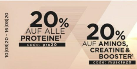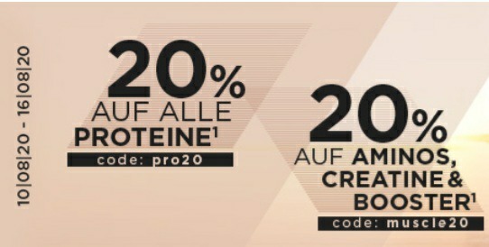 - 20% Rabatt auf alle Proteine, Booster, Creatine & Aminos