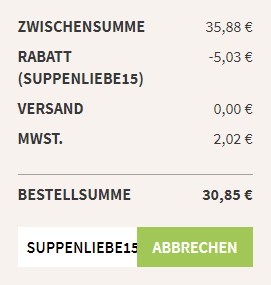 Um den Rabatt zu bekommen nutzt bitte den Gutschein SUPPENLIEBE15