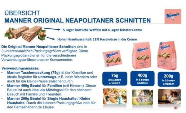 Die Manner Neapolitaner-Schnitten sind nicht nur in Österreich, sondern auch international sehr beliebt. Sie werden gerne als Snack für zwischendurch, aber auch als Dessert oder zum Kaffee serviert. Die Verpackung der Schnitten ist praktisch und handlich, so dass man sie überall hin mitnehmen kann.