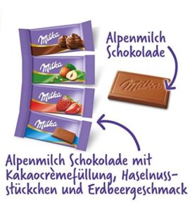 - Milka Naps sind als Alpenmilch Variante oder im Mix mit 4 leckeren Sorten erhältlich / Die Anzahl der Täfelchen pro Sorte kann variieren