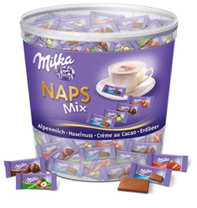 - Milka Naps Mix sind kleine, zartschmelzende Schokoladentäfelchen in den Sorten Alpenmilch, Erdbeer, Haselnuss und Crème au Cacao