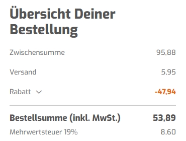 Die Versandkosten betragen 5,95€ pro Bestellung, entfallen jedoch ab 65€ Bestellwert.