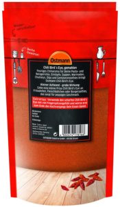 - Lieferumfang: 1 x Chili Bird’s Eye gemahlen 250 g, Chilipulver extrem scharf im wiederverschließbaren Standbeutel von Ostmann.