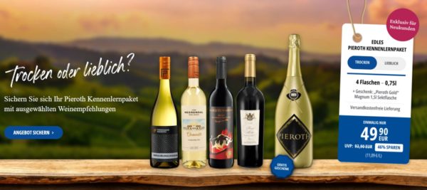 Pieroth: 4 Flaschen Wein + 1,5L Pieroth Gold Magnum Sektflasche für 49,90€