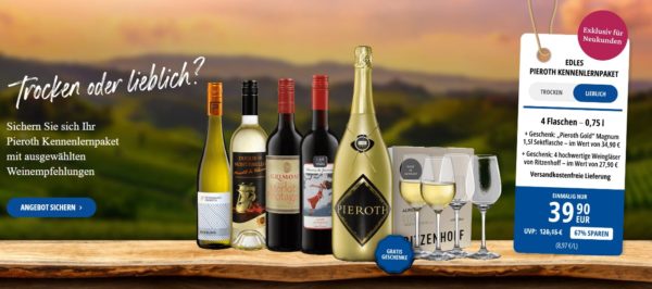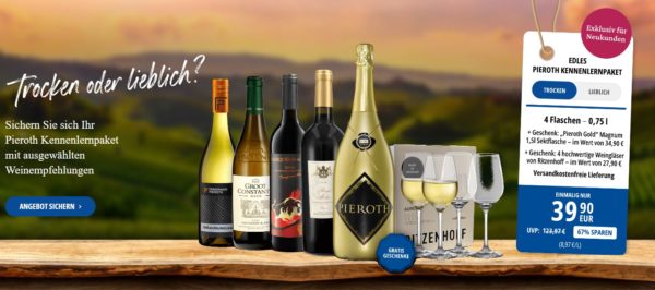 Bei Pieroth bekommt ihr gerade als Neukunde 4 Flaschen Wein (trocken oder lieblich) + 1,5L Magnum Sektflasche + 4 hochwertige Weingläser von Ritzenhoff für 39,90€ (Vergleichspreis ~124€) Ersparnis ~84€