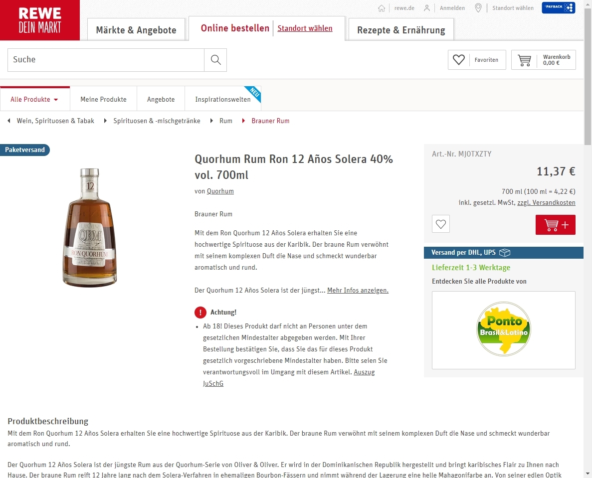 Denn bei REWE im Online-Shop bekommt man 2x den Quorhum 12 Anos Solera Rum (0,7l, 40%) für 22,74€ (Vergleichspreis: ~64€) Ersparnis ~41€ – ergibt 11,37€/Flasche.