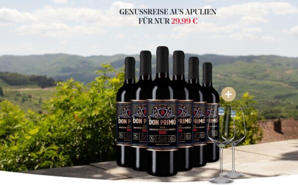 Der Don Primo Rosso Puglia ist ein unkomplizierter, süditalienischer Rotwein, der genau das liefert, was man sich von Apulien oft wünscht: viel Frucht, weiche Tannine und ein angenehm warmer Charakter. Im Glas zeigt er sich meist in einem satten Rubinrot. In der Nase dominieren reife dunkle Beeren wie Brombeere und Schwarzkirsche, dazu kommen häufig Noten von Pflaume, ein Hauch Kakao und eine leichte Würze, die an mediterrane Kräuter erinnern kann. Am Gaumen wirkt er rund und zugänglich, mit milder Säure und einem geschmeidigen Mundgefühl – eher „easy drinking“ als kantig oder streng.