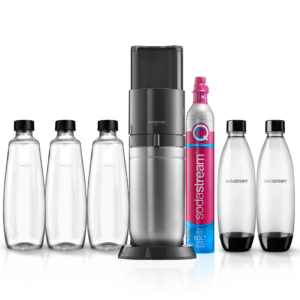 - LIEFERUMFANG: 1x SodaStream DUO Wassersprudler (Farbe: Titan), 1x 1L spülmaschinenfeste Glasflasche, 1x 1L spülmaschinenfeste KSTF-Flasche