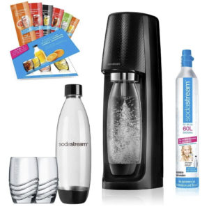 - Lieferumgang: 1 x SodaStream Easy (Farbe: schwarz), 1 x SodaStream CO2-Zylinder, 2 x PET-Flasche 1 L (BPA Frei), 2 x Design Trinkgläser (Glas), 6 x Sirupproben