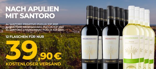 das Weinpaket nach Apulien mit Santoro mit 12 Flaschen für 39,90€ inklusive Versand.