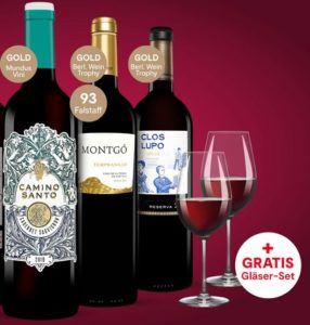 Bei Vinos bekommt ihr das 6er Paket Rotwein (alle goldprämiert) inkl. 2 x Schott Zwiesel für 30,98€