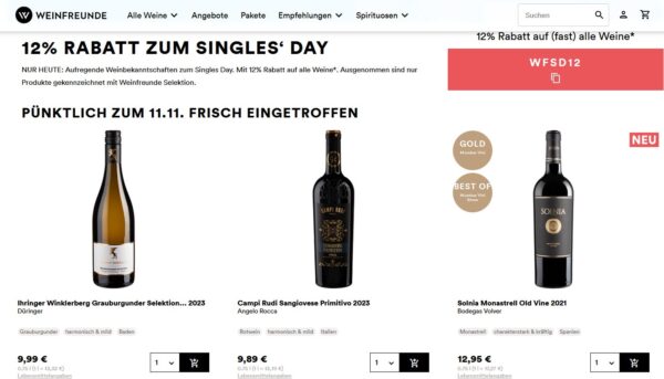 Weinfreunde: 12% Rabatt zum Singles‘ Day