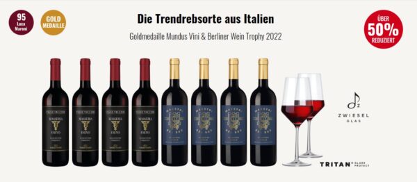 Weinpaket 8 Flaschen „Die Trendrebsorte aus Italien Due Primitivo“ mit gratis Schott Zwiesel Gläser für 39,90€