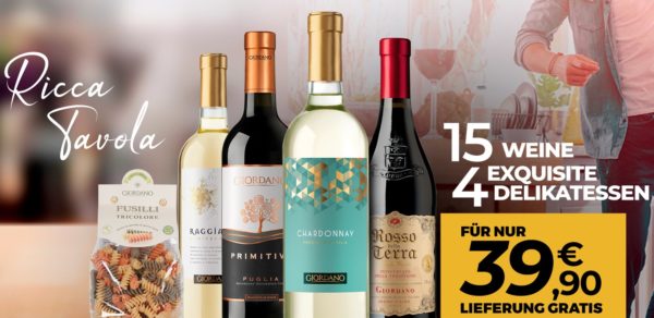 Weinliebhaber aufgepasst! Habt ihr Lust mal wieder etwas Neues zu probieren? Bei Giordano erhaltet ihr ein Paket mit 15 Weinen und 4 exquisiten Delikatessen für nur 39,90€ (regulärer Preis: ~120€) Ersparnis ~80€