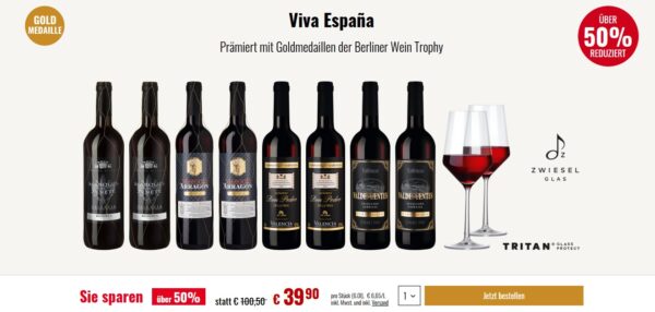 Ihr bekommt hier also 8 Flaschen prämierten Spanischen Wein + 2 Gläser (Wert 19,90€) für 39,90€.