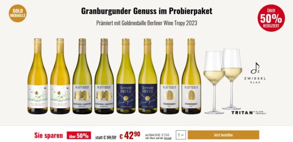 Granburgunder Genuss im Probierpaket mit 8 Flaschen Goldmedaille Berliner Wine Tropy 2023 + 2 Gläser (Wert 19,90€) für 42,90€.