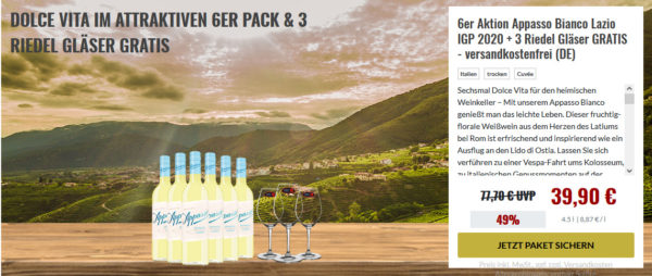 - 6er Aktion Appasso Bianco Lazio IGP 2020 + 3 Riedel Gläser GRATIS – versandkostenfrei (DE) für 39,90€ statt 77,70€