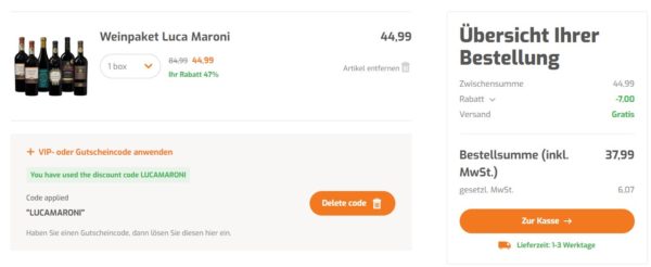 Bei Weinvorteil bekommt ihr das Weinpaket Luca Maroni (bestehend aus 6 Flaschen) für 37,99€ (regulärer Preis ~85€) Ersparnis ~47€
